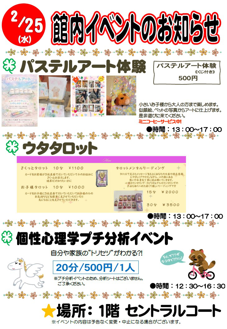 | 館内イベントのお知らせ2026-02-25 パステルアート体験 2026/02/07 更新 |