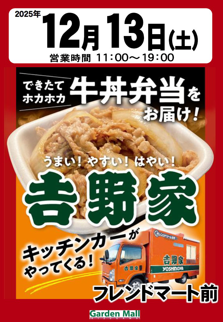 2025年12月13日(土)◆牛丼の吉野家 時間:11:00~19:00●場所:フレンドマート前※催事の内容は予告なく変更・中止になる場合がございます。