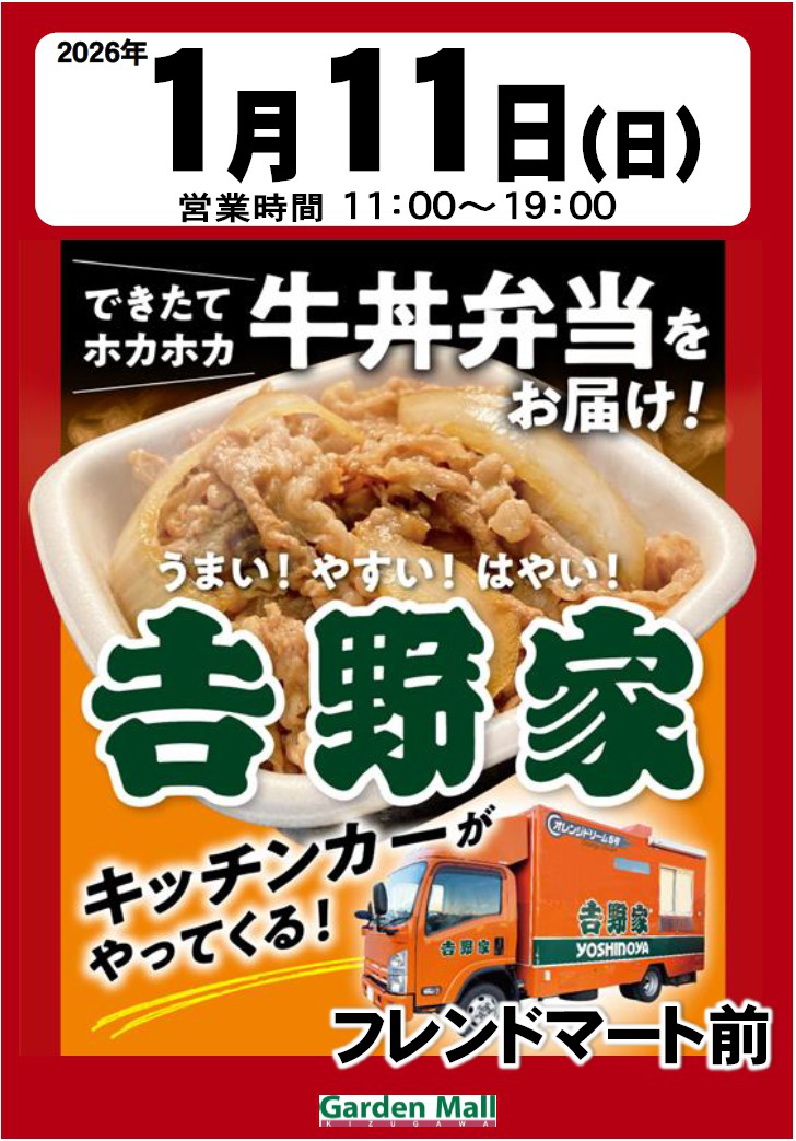◆牛丼の吉野家 時間:11:00~19:00●場所:フレンドマート前※催事の内容は予告なく変更・中止になる場合がございます。