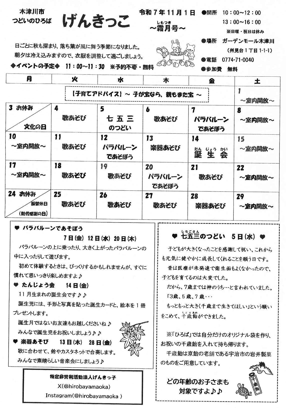 ![]() | 11月の予定表2025.11.05更新 11月の予定表です! 木津川市つどいの広場 げんきっ子では、就学前の子どもちゃんと、そのお父さんお母さん達が気軽に交流できる憩いの場所です! いつもベテランの保育士さんがいて、子育て中の悩みを相談することもできますよ! どうぞ、お気軽にご利用下さいませ! |