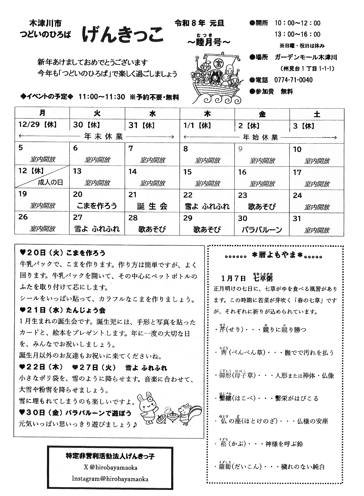 ![]() | 2026年1月の予定表2025.12.25更新 2026年1月の予定表です! 木津川市つどいの広場 げんきっ子では、就学前の子どもちゃんと、そのお父さんお母さん達が気軽に交流できる憩いの場所です! いつもベテランの保育士さんがいて、子育て中の悩みを相談することもできますよ! どうぞ、お気軽にご利用下さいませ! |