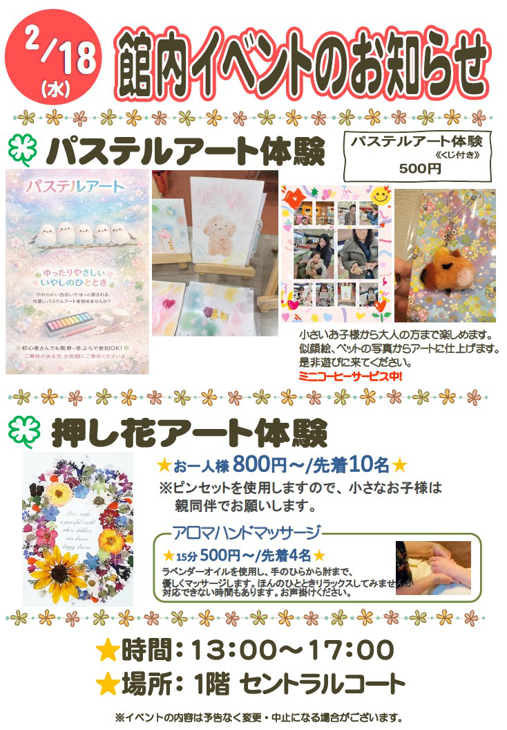 | 館内イベントのお知らせ2026-02-18 ◆パステルアート体験 2026/01/26 更新 |