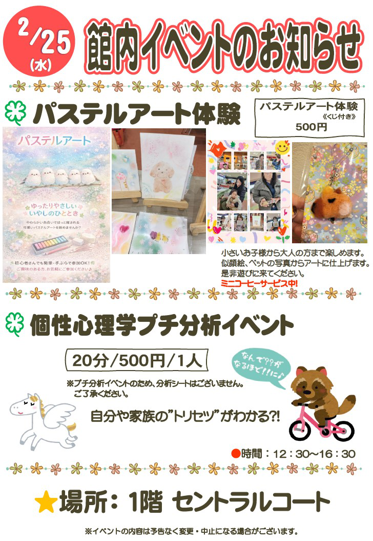 | 館内イベントのお知らせ2026-02-25 パステルアート体験 2026/01/26 更新 |