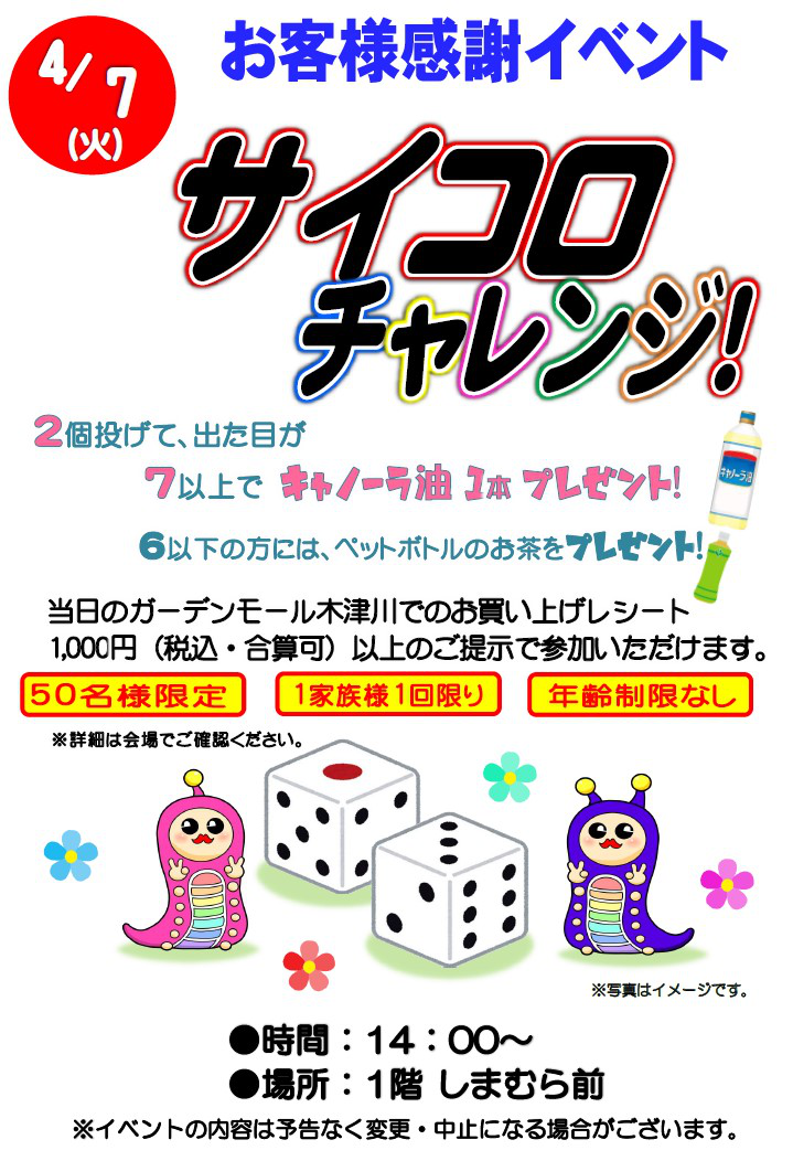 | サイコロチャレンジ!2026-04-07 お客様感謝イベント 2026/03/23 更新 |