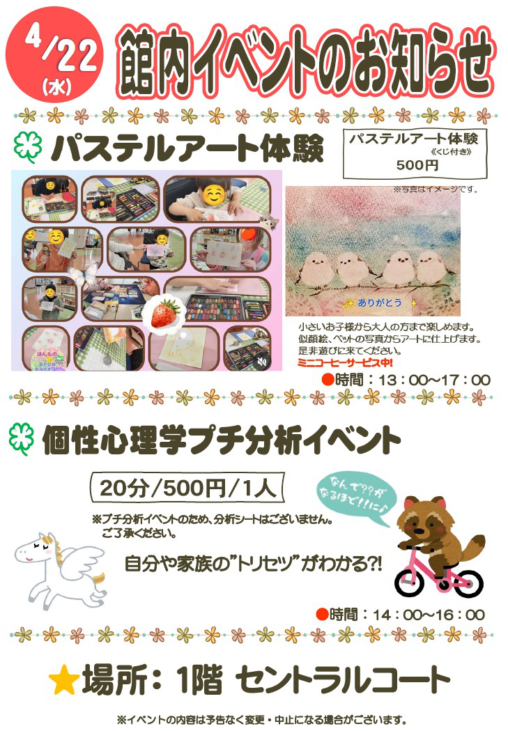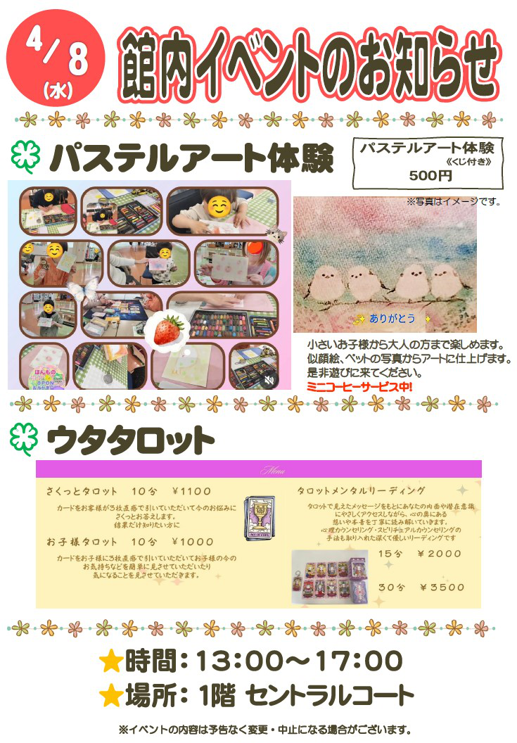 | 館内イベントのお知らせ2026-04-22 ◎パステルアート体験 2026/03/23 更新 |