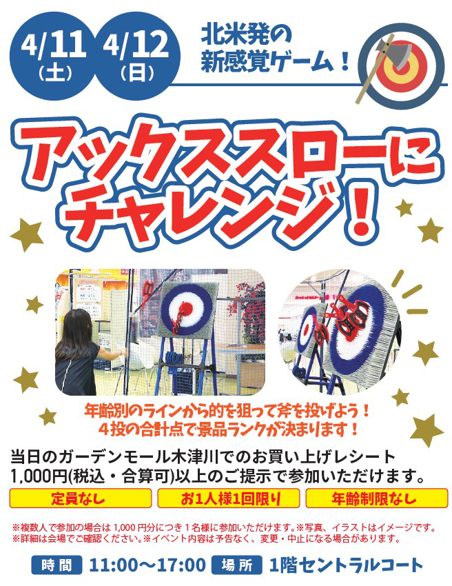 | アックススローにチャレンジ!2026-04-11~2026-04-12 北米発の新感覚ゲーム! 2026/03/23 更新 |