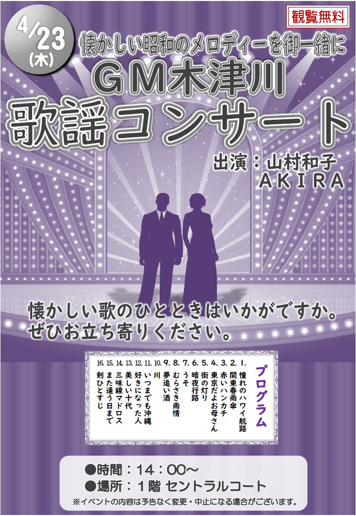 | GM木津川歌謡コンサート2026-04-23 懐かしい昭和のメロディーを御一緒に 2026/03/23 更新 |