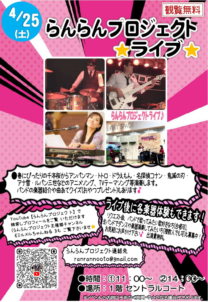 | らんらんプロジェクトライブ2026-04-25 ●春にぴったりの千本桜からアンパンマン・トトロ・ドラえもん・名探偵コナン・鬼滅の刃・アナ雪・ルパン三世などのアニメソング、TVテーマソング等演奏します。バンドの楽器紹介や曲あてクイズ(おやつプレゼント)もあります♪ 2026/03/25 更新 |