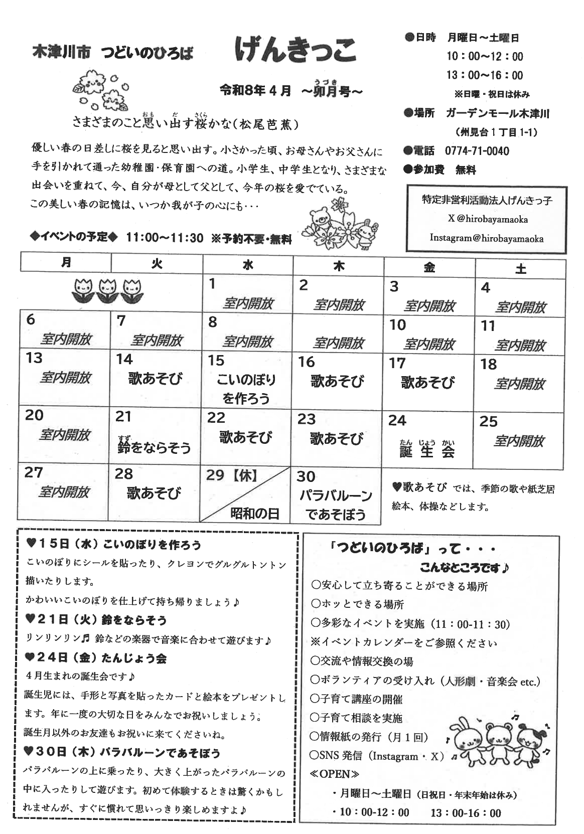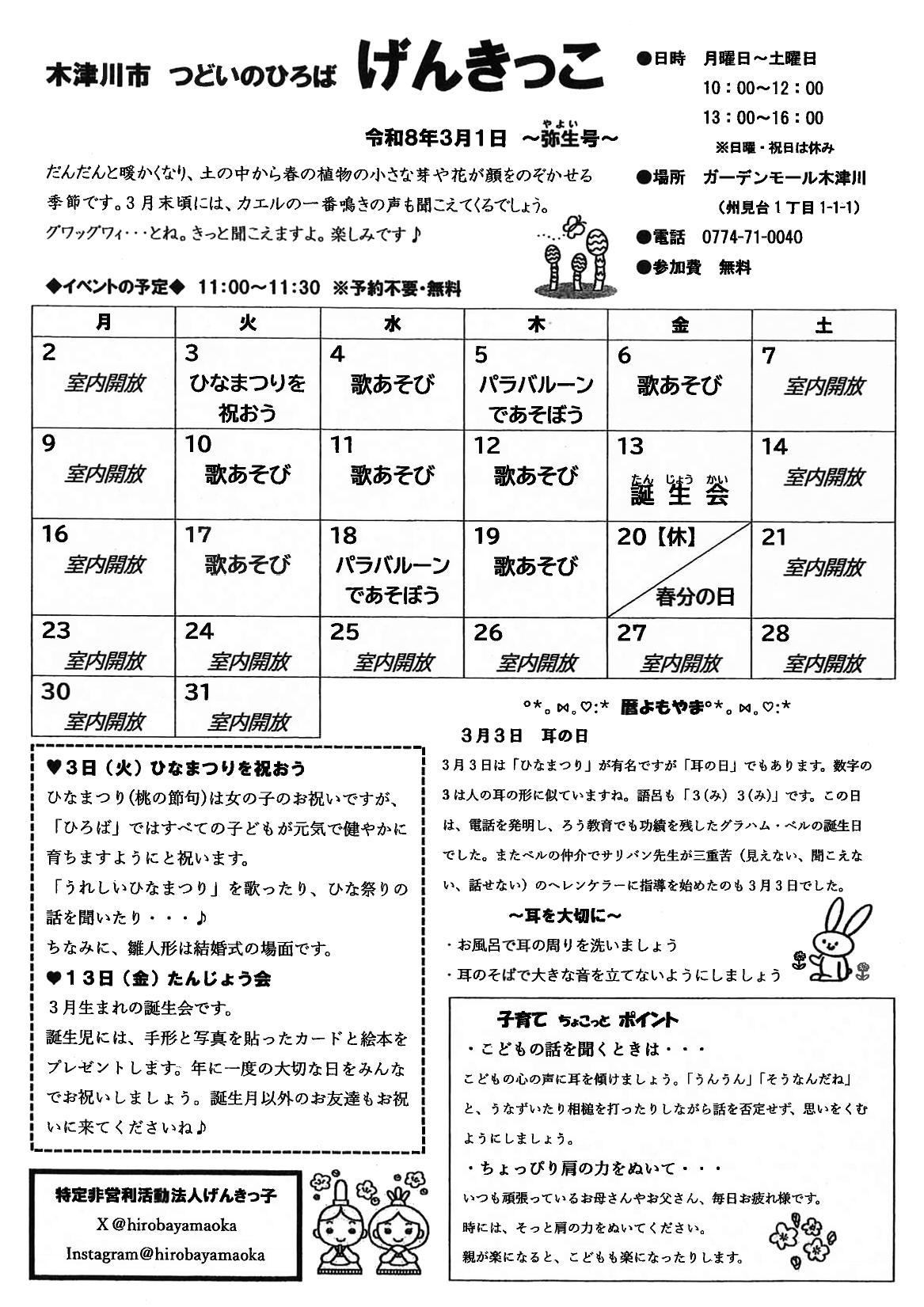 子育て支援 営業時間:10:00~16:00 月~土曜日 (日曜日・祝日・年末年始) (12:00~13:00の間は清掃、消毒の為閉めています)
